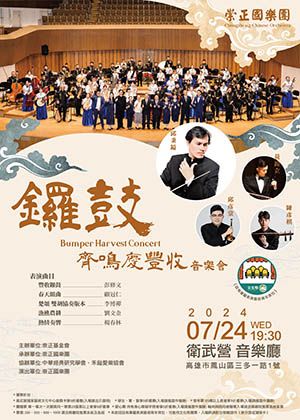崇正國樂團 近期演出 2026.01.11 (日) - 2026.01.11 (日) 衛武營國家藝術文化中心 2026鑼鼓齊鳴慶豐收音樂會 #指揮:邱秉鎰 #二胡協奏:陳彥棋 #嗩吶協奏:邱彦棠 #演出:崇正國樂團 過往演出 2024.11.03 (日) - 2024.11.03 (日) 衛武營國家藝術文化中心 2024鑼鼓齊鳴慶豐收音樂會 #崇正國樂團『2024鑼鼓齊鳴慶豐收音樂會』 #指揮:邱秉鎰 2025.06.28 (六) 嘉義縣表演藝術中心 2025神奇之星-邱彥棠嗩吶獨奏音樂會 #邱彥棠 #神奇樂坊 #國樂 #嗩吶 2025.04.17 (四) - 2025.07.05 (六) 國家兩廳院 2025鑼鼓齊鳴慶豐收音樂會 #指揮:邱秉鎰 #笙協奏:邱彦暄 #琵琶協奏:李乃亘 #笛子協奏:林家妤 2023.10.14 (六) - 2023.10.14 (六) 2023鑼鼓齊鳴慶豐收音樂會 #指揮:邱秉鎰 #協演人員:邱彦暄 我們覺得或許你也會喜歡 夜店馬戲團Crik La Putyka 默克德意志愛樂樂團 廣藝基金會 EyeMusic視障樂團 新世代劇場—里昂國家戲劇中心 佳安消防工程股份有限公司