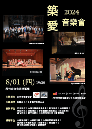 新竹市築愛協會 過往演出 2025.05.24 (六) 新竹市文化局演藝廳 2025築愛音樂會-10年築愛 緣來有您 #原聲童聲合唱團 #親愛愛樂 #泰雅青年 #泰武古謠 2025.08.01 (五) - 2025.08.01 (五) 新竹縣政府文化局 2025築愛音樂會-10年築愛PLUS #音樂 #合唱 #室內樂 #花腔女高音 #國際合作 2024.08.01 (四) 新竹市文化局演藝廳 2024築愛音樂會 #鋼琴家陳育志 #拿互依&馬胎合唱團 #Cantus女聲合唱團 #Aquarelle 鋼琴三重奏 我們覺得或許你也會喜歡 桃園市政府客家事務局 澳門中樂團 心結室內樂團 動物樂團 深聲藝術有限公司 韋瓦笛室內樂團