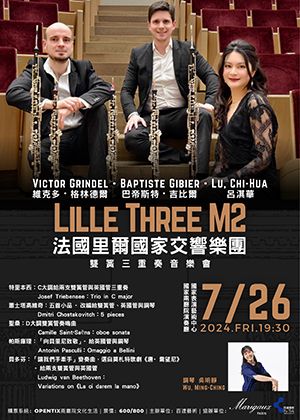 百達藝術 過往演出 2024.07.26 (五) 國家兩廳院 法國里爾國家交響樂團-雙簧三重奏音樂會 #維克多格林道爾 #巴帝斯特吉比爾 #呂淇華 #吳明靜 我們覺得或許你也會喜歡 涴莎藝術展演中心 大世紀唱團 PLAYground 南村劇場 擊盒工作室 紅樓劇場 臺北市金華國小合唱團