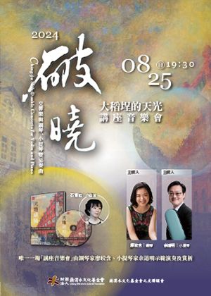 石青如 近期演出 2025.12.06 (六) - 2025.12.06 (六) 宜蘭演藝廳 蘭陽交響樂團九週年系列音樂會《石青如清唱劇——那些天蔣渭水在牢裡》 #蘭陽交響樂團/游家輔 #聲納合唱團、迎曦女聲合唱團、長庚校友合唱團/翁健民 #那些天 蔣渭水在牢裡/石青如 #詩詞朗誦/邢子青/音樂會導聆/蔣理容 過往演出 2024.06.21 (五) 衛武營國家藝術文化中心 【因為音樂】台北愛樂合唱家族高雄巡演 #台北愛樂室內合唱團 #台北愛樂青年合唱團 #台北愛樂婦女合唱團 #因為音樂 2024.09.08 (日) 衛武營國家藝術文化中心 台灣獨奏家交響樂團《風起王城》 #台灣獨奏家 #臺南400 #風起王城 #蕭邦享 2025.10.23 (四) - 2025.10.23 (四) 臺北市中山堂 因為有你 就是天堂 #臺北市青青合唱團 #請問芳名人聲樂團 #台灣安寧照顧協會 #指揮張成璞 2024.05.11 (六) 臺南文化中心 臺南市交響樂團《風起王城》 #臺南市交響樂團 #臺南400 #臺南國際音樂節 #石青如 2024.08.25 (日) 國家兩廳院 石青如《破曉~大稻埕的天光》鋼琴、小提琴雙協奏曲 #石青如 #破曉大稻埕的天光 #廖皎含 #余道明 2025.10.25 (六) - 2025.10.25 (六) 台北生技園區 友園相逢 #劉靜諭 #鍾華琳 #逢友室內合唱團 #新竹科學園區合唱團 2024.09.14 (六) - 2024.09.15 (日) 國家兩廳院 2024台灣芭蕾舞團創作演出《獻給台灣的一首詩》 #芭蕾舞 #舞蹈 #台灣芭蕾舞團 2024.05.06 (一) - 2024.05.07 (二) 國家兩廳院 2024師友合唱團「啟航」世界合唱大賽行前音樂會 #師友合唱團 #曾惠君 2024.10.05 (六) 行過-盡看人生的春夏秋冬~一場樂齡共伴的跨界音樂會 #莊敏仁 #香頌合唱團 #光明國中舞蹈 我們覺得或許你也會喜歡 優樂弦樂團 社團法人中華民國身心障礙者藝文推廣協會 新古典愛樂 誠品人 安永財務管理諮詢服務股份有限公司 台北爵士大樂隊