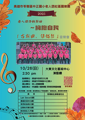 老人囡仔國樂團 過往演出 2025.10.26 (日) - 2025.10.26 (日) 高雄市文化局-大東文化藝術中心 國樂團-老人囝仔的對話2025-「擁抱自我」 #高雄市苓雅區中正國民小學老人囝仔社區國樂團 我們覺得或許你也會喜歡 Diapason鋼琴五重奏室內樂團 親愛愛樂弦樂團 薩摩亞商志強國際企業股份有限公司臺灣分公司 豐年國際文化事業有限公司 聲協樂集 青少年小提琴演奏者2