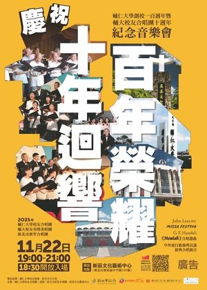 輔仁大學校友合唱團 過往演出 2025.11.22 (六) - 2025.11.22 (六) 新北市文化局-新莊文化藝術中心 輔大創校一百週年暨輔大校友合唱團十週年紀念音樂會 #輔仁大學校友合唱團 #十年迴響 #百年榮耀 我們覺得或許你也會喜歡 富邦文教基金會 東方天籟合唱團 大清華傳媒股份有限公司 CHIMEI 奇美文化基金會 美國國家電影保護局 富瑜樂團