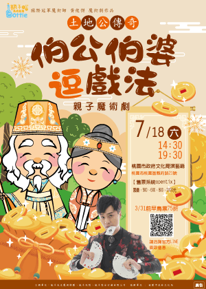 瓶子先生魔術劇團 近期演出 2026.07.18 (六) - 2026.07.18 (六) 桃園市政府文化局 國際魔術冠軍黃俊傑創作土地公傳奇《伯公伯婆逗戲法》 0 人想看 我想看 過往演出 2025.02.22 (六) - 2025.02.23 (日) 苗栗縣政府文化觀光局 國際魔術冠軍黃俊傑創作《伯公伯婆逗戲法》 0 人想看 我想看 2025.05.03 (六) - 2025.07.06 (日) 澎湖縣文化局 親子魔術劇《海洋奇蹟失竊的珍珠》。 0 人想看 我想看 2024.12.20 (五) - 2024.12.21 (六) 文山劇場 聖誕老人來了魔術劇場 0 人想看 我想看 多媒體影音 我們覺得或許你也會喜歡 大墩國樂團 新生一號劇團 水影舞集青少團 南風三重奏 臺中國家歌劇院 一蕃燒-火燒番薯專門店