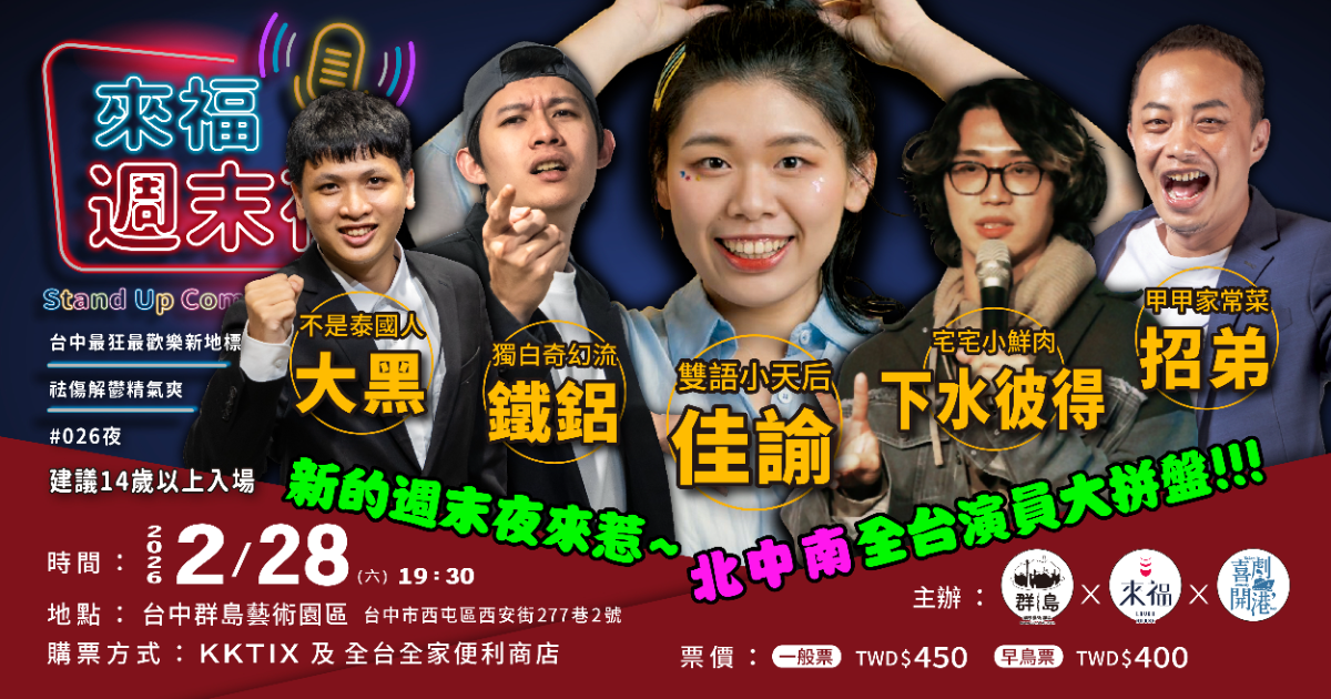 來福好事 LAUGH HOUSE 近期演出 2026.02.28 (六) - 2026.02.28 (六) 群島國際藝術園區 來福週末夜 #026 0 人想看 我想看 過往演出 2024.09.28 (六) - 2024.09.28 (六) 群島國際藝術園區 來福週末夜 #021 0 人想看 我想看 2025.11.29 (六) - 2025.11.29 (六) 群島國際藝術園區 【11/29台中】《鐵綸三項》站立喜劇雙拼秀 0 人想看 我想看 我們覺得或許你也會喜歡 基德皮沃現代舞團 少林長拳門-力行武術總會 Wise Children 好魔力口琴樂團 哈囉樂團 洄聲•室內合唱團