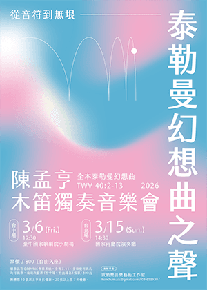 高雄直笛合奏團 近期演出 2026.03.06 (五) - 2026.03.15 (日) 臺中國家歌劇院 「從音符到無垠 - 泰勒曼幻想曲之聲」全本泰勒曼幻想曲TWV 40:2-13木笛獨奏音樂會 0 人想看 我想看 我們覺得或許你也會喜歡 獨秀文化有限公司 數字王國集團 龍谷大學附屬平安高等學校吹奏樂部 夏至愛樂 傳源文化藝術團 臺藝彈撥樂團